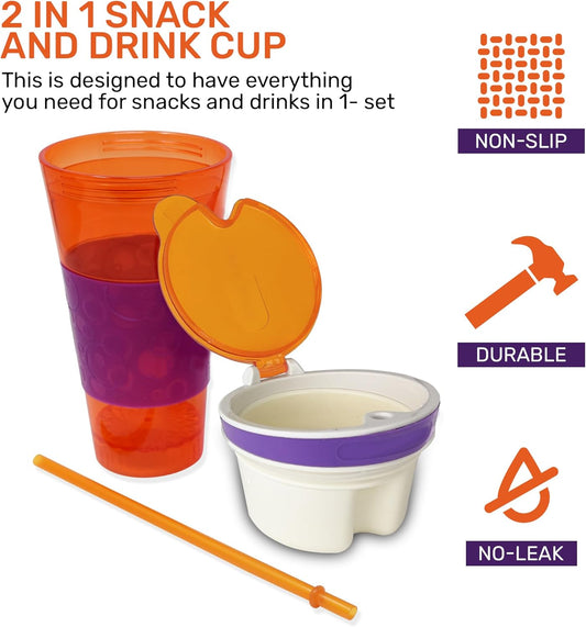 2 in 1 Snack Drink Cup Kids Spill Proof Tumbler Plastic Straw Lid Locks 16 Oz