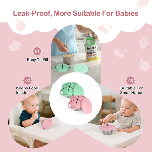 2 Pack Snack Cups for Toddlers Spill Proof - Detachable Stainless Steel Toddler Snack Cups with Silicone Lids & Handles - Dishwasher Safe Baby Snack Containers for Mess-Free Snacking (Green and Pink)