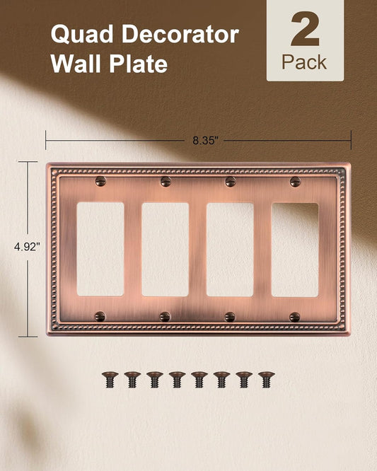 2-Pack Quad Decorator Outlet Cover Plate, Antique Copper Pearls Decorative Switch Plates and Outlet Covers, Metal Wall Plates for Electrical Outlets, Receptacle, GFCI Outlet, Dimmer Switch