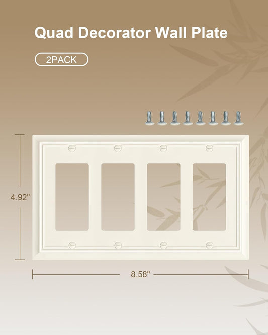 2-Pack Quad Decorator Outlet Cover Plate, White Decorative Switch Plates and Outlet Covers, Natural Bamboo Fiber Wall Plates for Electrical Outlets, Receptacle, GFCI Outlet, Dimmer Switch