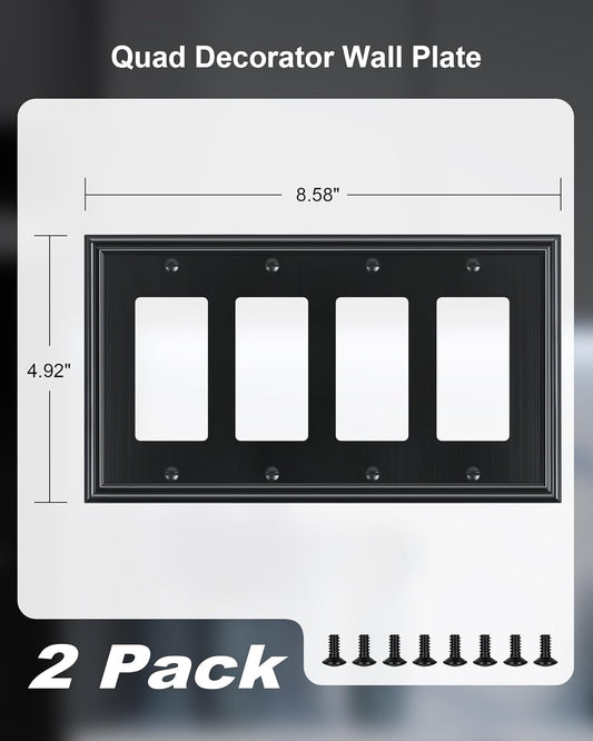 2-Pack Quad Decorator Outlet Cover Plate, Zinc Alloy Decorative Black Switch Plates and Outlet Covers, 4 Gang Wall Plates for Electrical Outlets, Receptacle, GFCI Outlet, Dimmer Switch