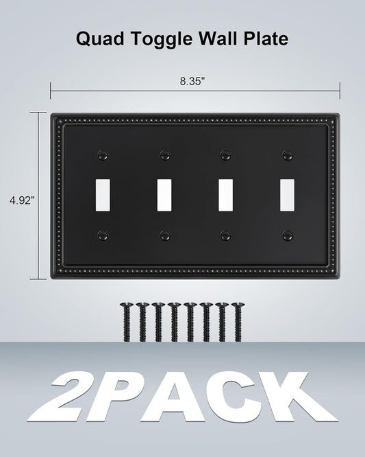 2-Pack Quad Toggle Light Switch Cover Plate, Durable Zinc Alloy Decorative Switch Plate Covers, Black 4 Gang Wall Plate for Toggle Light Switch and Rotary Dimmer Switch