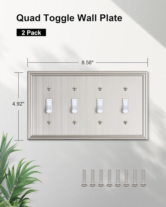 2-Pack Quad Toggle Light Switch Cover Plate, Durable Zinc Alloy Decorative Switch Plate Covers, Brushed Nickel 4 Gang Wall Plate for Toggle Light Switch and Rotary Dimmer Switch