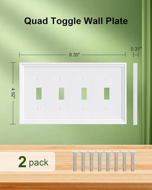 2-Pack Quad Toggle Light Switch Cover Plate, Durable Zinc Alloy Decorative Switch Plate Covers, Pure White 4 Gang Wall Plate for Toggle Light Switch and Rotary Dimmer Switch
