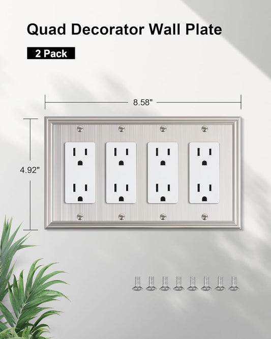 2-Pack Quad Decorator Outlet Cover Plate, Zinc Alloy Brushed Nickel Switch Plates and Outlet Covers, 4 Gang Wall Plates for Electrical Outlets, Receptacle, GFCI Outlet, Dimmer Switch