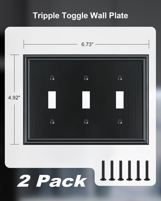 2-Pack Triple Toggle Light Switch Cover Plate, Durable Solid Zinc Alloy Decorative Switch Plate Covers, Black 3 Gang Wall Plate, Corrosion Resistant
