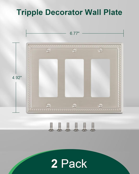 2-Pack Triple Decorator Outlet Cover Plate, Brushed Nickel Pearls Decorative Switch Plates and Outlet Covers, Metal Wall Plates for Electrical Outlets.