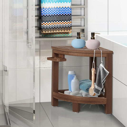 2-Tier Corner Shower Bench with Hooks & Soap Dish, HDPE Waterproof Stool for Shaving Legs, Non-Slip Shower Foot Rest - Brown