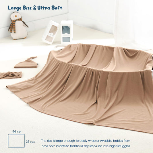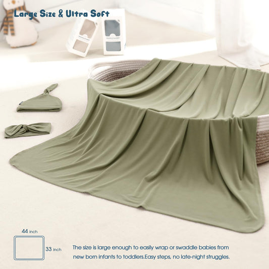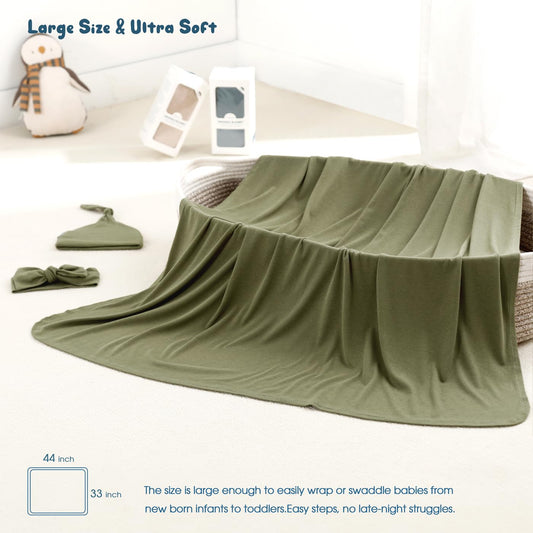 GRSSDER Newborn Swaddle Blanket, Ultra Soft Jersey Receiving Blanket with Matching Headband and Beanie Set 33×44", Stretchy Baby Neutral Swaddle Wrap for Girls and Boys