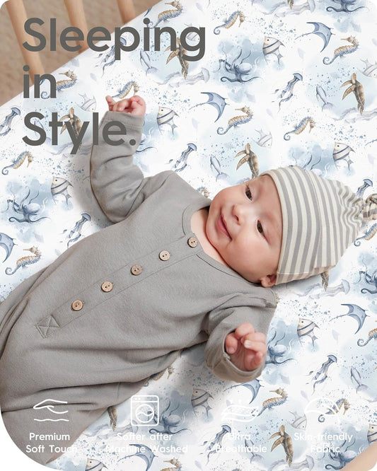 Graco Pack and Play Fitted Sheets - 2 Pack Mini Crib Sheets, Hypoallergenic and Soothing, Premium Jersey Fabric, Safari Sea Animals Pattern