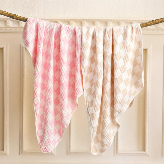 Ultra Soft Checkered Muslin Baby Blanket Pack of 2 Cotton Swaddles Bed Blankets for Babies and Toddlers Girls Newborn 42 x 42 inches Cream and Pink