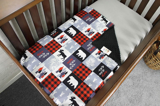 Top Tots Baby Blanket - Minky, Moose, Bear, Deer Heads, Trees and Vines, Red and Black Plaid with White and Gray