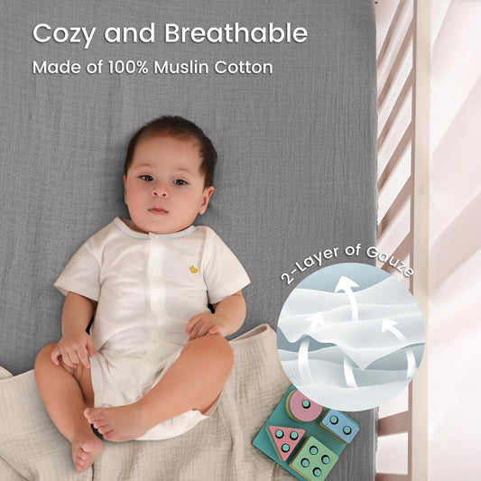 david's kids Muslin Crib Sheets for Boys Girls, 2 Pack 100% Cotton Soft Breathable Fitted Baby Sheet Set, 28x52 Inch Fits Standard Crib and Toddler Mattresses, Beige & Grey