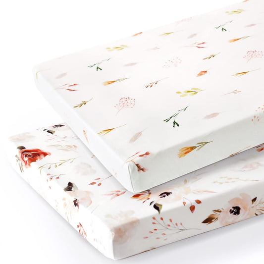 2-Pack Mini Crib Sheets Fitted - 38x26 Pack N Play Sheets for Pack and Play Mattress, Organic Cotton, Soft & Breathable Playard Bedding, Neutral Mini Toddler Bed Cover for Boys, Girls (Wildflowers)