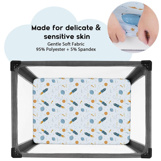 Yoofoss Pack and Play Sheets Fitted, Mini Crib Sheets 2-Pack for Pack N Play Mattress, Stretchy Playard Sheet, Soft and Breathable Blue Rocket