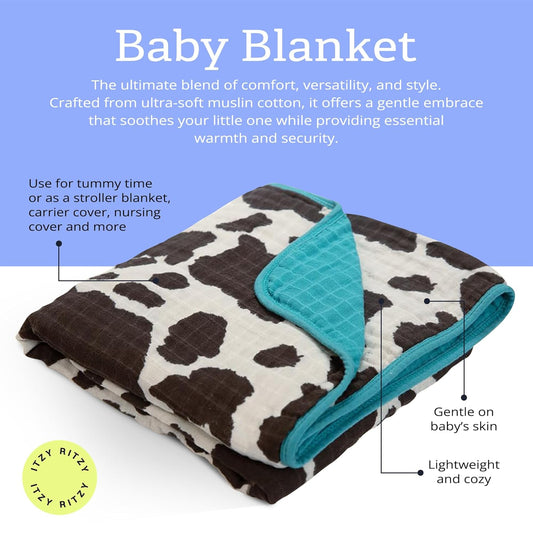Itzy Ritzy Baby Blanket – Soft Cotton Muslin Multi-Use Blanket - Can Be Used as a Tummy Time Mat, Nursing Cover, Stroller Shade & More – Measures 30" x 40", Machine Washable (Cow Print)