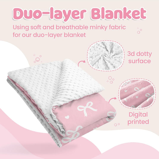 Bow Minky Baby Blanket 30 x 40 Inches for Girls, Soft Plush Receiving Blanket with Dotted Back, Gift for Toddler Newborn Infant Christmas Birthday Baby Shower