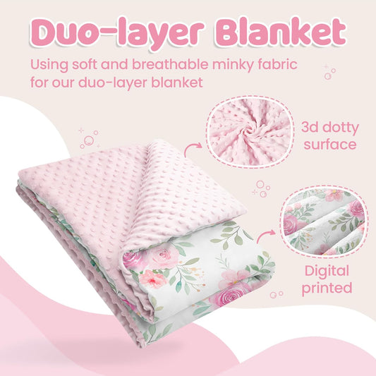 Floral Minky Baby Blanket 30 x 40 Inches for Girls, Soft Plush Receiving Blanket with Dotted Back, Gift for Newborn Infant Toddlers, Baby Shower, Christmas Birthday