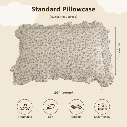 BuLuTu Muslin Cotton Kids Pillowcases for Girls Boys Shabby Chic Blue Floral Print Pillow Case Beige Toddler Pillowcases Standard Size Pillow Cover with Ruffles, 20"x26", 1 pc
