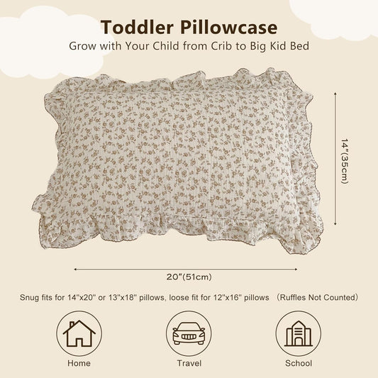 BuLuTu 2 Layers Muslin Toddler Pillowcases Fits for Crib Cot Cradle, Cotton Floral Pillow Cases for 1 2 3 4 5 6 Years Old Girls Boys, Envelope Travel Toddler Pillow Cover Protector with Ruffles