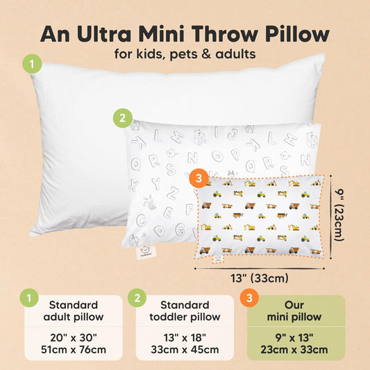 Mini Toddler Pillow with Pillowcase - 9x13 My Little Dreamy Travel Kids Pillow for Sleeping, Toddler Bed, Small, Tiny, Organic Cotton Pillowcase, Soft & Breathable, Kids 2-4 Years Old (Construction)