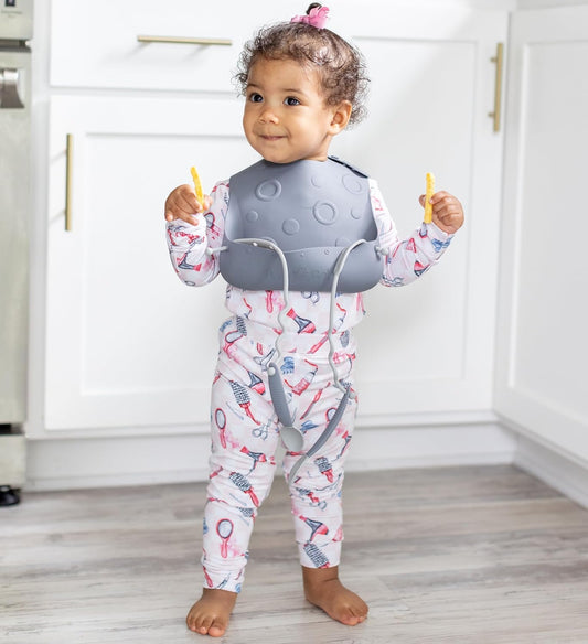BUSY BABY Bungee Bib & Utensil Set – Adjustable Silicone Bib with Pocket & Tethered Utensils for Babies & Toddlers