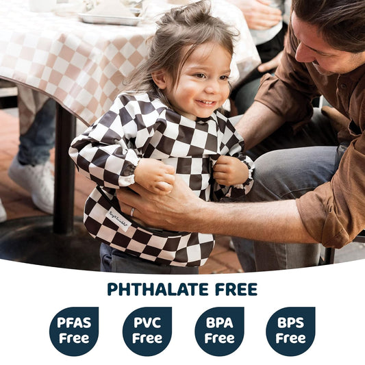 Tiny Twinkle Mess Proof Baby Bib,Waterproof Smock Baby Bib for Eating,Machine Washable Long Sleeve Bib,Baby Led Weaning,Toddler Bib,BLW Supplies(Checkers Black, Small 6-24 Months)