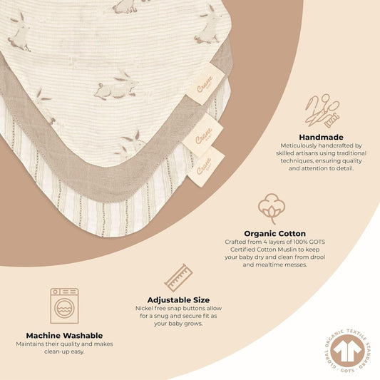Crane Baby Soft Muslin Bandana Bibs for Boys & Girls, Safari Animal Baby Bibs, Adjustable Absorbent Burp Bandana Set, Pack of 3