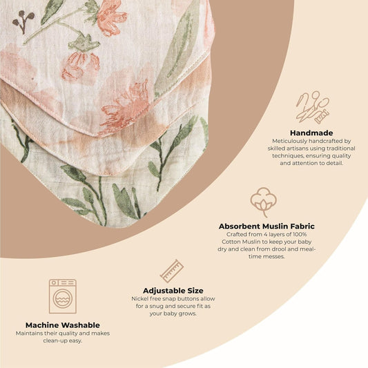 Crane Baby Soft Muslin Baby Bib Set, Adjustable and Absorbent Bandana Style Bibs for Boys and Girls, Floral, 3 Piece, 18.5” x 9”