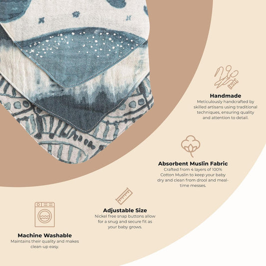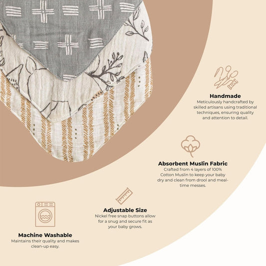 Crane Baby Soft Muslin Baby Bib Set, Adjustable and Absorbent Bandana Style Bibs for Boys and Girls, River, 3 Piece, 18.5” x 9”
