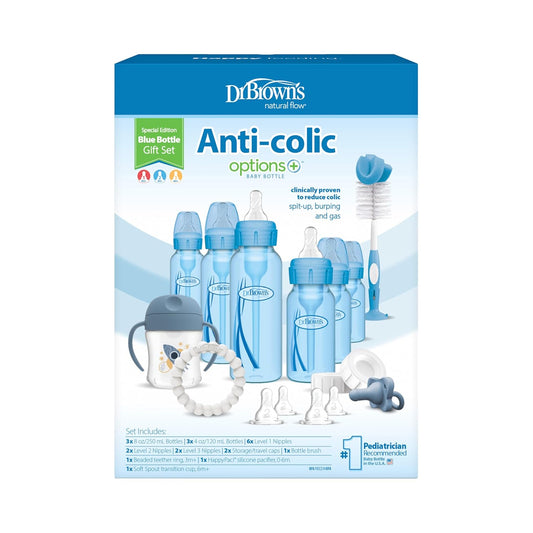 Dr. Brown's Natural Flow Anti-Colic Options+ Special Edition Blue Baby Bottle Gift Set with Soft Sippy Spout Transition Cup, Flexees Teether, Bottle Cleaning Brush and Travel Caps
