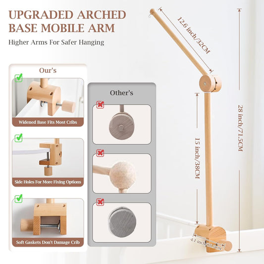 Baby Crib Mobile Arm - Wooden Mobile Arm with Height Adjustable&360° Rotatable Upgraded Arched Base Nursery Mobile Holder for Crib Mobile Hanger Baby Crib Attachment Nursery Decor