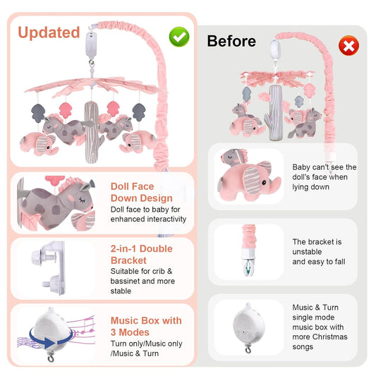 FEISIKE Baby Crib Mobile for Girls Boys with 3 Modes Digital Musical Motor(Rotating Only, Music Only, Rotating & Music, 35 Lullabies, Pink Elephant Nursery Mobile, Knob Type
