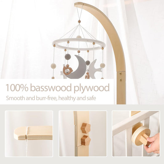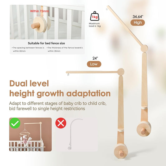 Baby Crib Mobile Arm Wooden Holder 30 inch Beech Hangers with Rotating Music Box Nursery Decor Attachment Safe Anti Slip Set