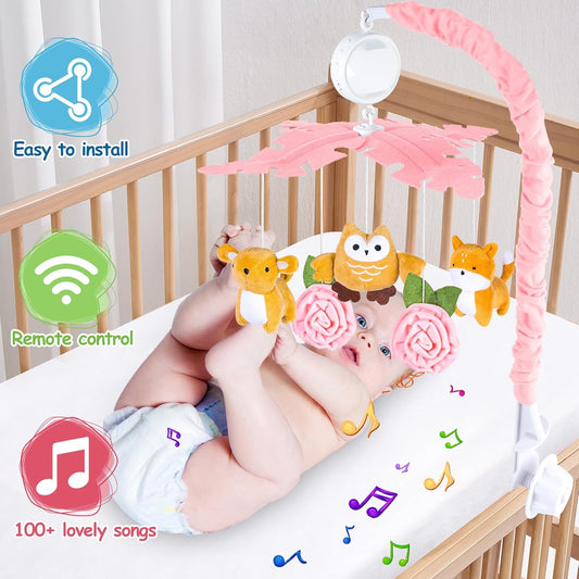 caterbee Baby Crib Mobile for Pack and Play, Crib Toys with Light and Musicial, Remote,Projector for Ages 0+ Months (Pink-Forest)