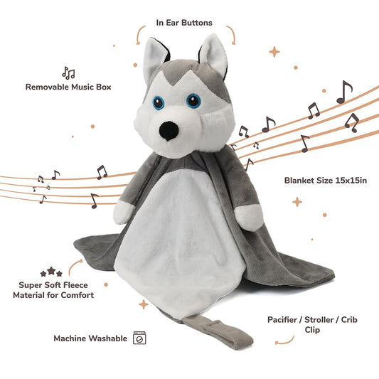 Love By Emi Baby Music Lovey Grey & White Husky, Baby Sleep Soother for Crib & Cuddle Bedtime, White Noise with Heartbeat & Lullaby, Plush Sound Toy, Stuffed Animal for Newborns, Infants & Toddlers