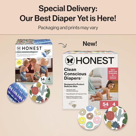 The Honest Company Clean Conscious Diapers for Delicate Skin | Up to 100% Leakproof | Hypoallergenic, Fragrance Free | Gender Neutral | Club Box, Size 4 (22-37 lbs), 54 Count (Prints May Vary)
