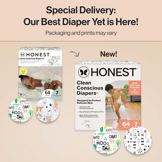 The Honest Company Clean Conscious Diapers for Delicate Skin | Up to 100% Leakproof | Hypoallergenic, Fragrance Free | Gender Neutral | Super Club Box, Size 7 (41+ lbs), 64 Count (Prints May Vary)