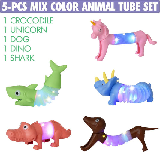 Boxgear 5-Pack LED Pop Tubes Mixed Animal Fidget Toys – Sensory Tubes for Toddlers – Cute Animal Sensory Fidget Toys for Girls and Boys – Stress-Relief Pop Sound Spring Toddler Sensory Toys