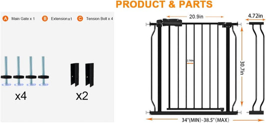 Wide Baby Gate for Stairs Doorways 30" Tall 34 to 38.5 Inch Wide Pressure Mounted Baby Gate Walk Through Child Gates for Kids or Pets Indoor Safety Gates
