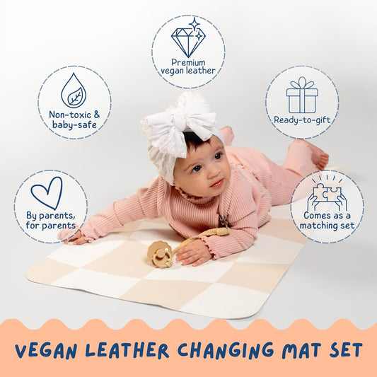 Leather Changing Mat with Reusable Waterproof Wet Bag, (16 x 30 Inches) Baby Changing Mat, Non-Toxic Changing Pad Portable Folds and Wipes Clean, Baby Changing Pad Travel (Checkered)