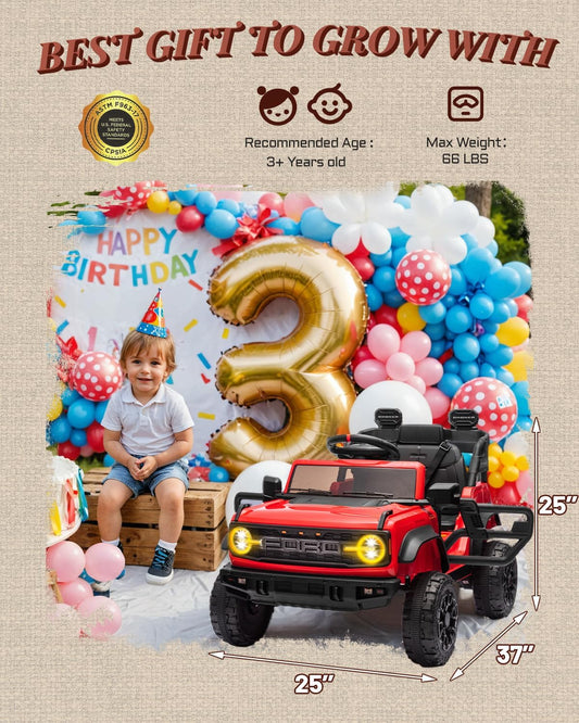 Ford Bronco Raptor Licensed 12V Ride on Toys, Kids Ride on Car with Remote Control, Electric Car for Toddler with Smooth Start, Openable Doors, MP3 Player, 3 Speeds (12V, Red)