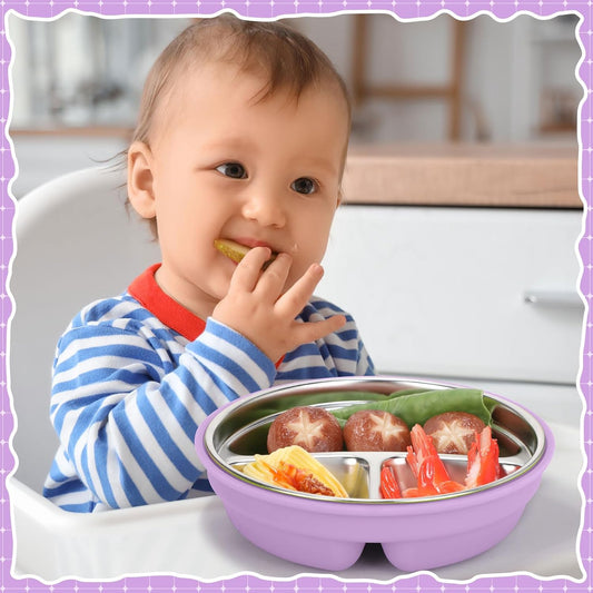 Nuogo 1 Pcs Stainless Steel Baby Suction Plates with Removable Silicone Shell 2-in-1 Metal Toddler Bowl Divided for Picky Eaters Kid Feeding Led Weaning Supply, Dishwasher Safe (Purple)
