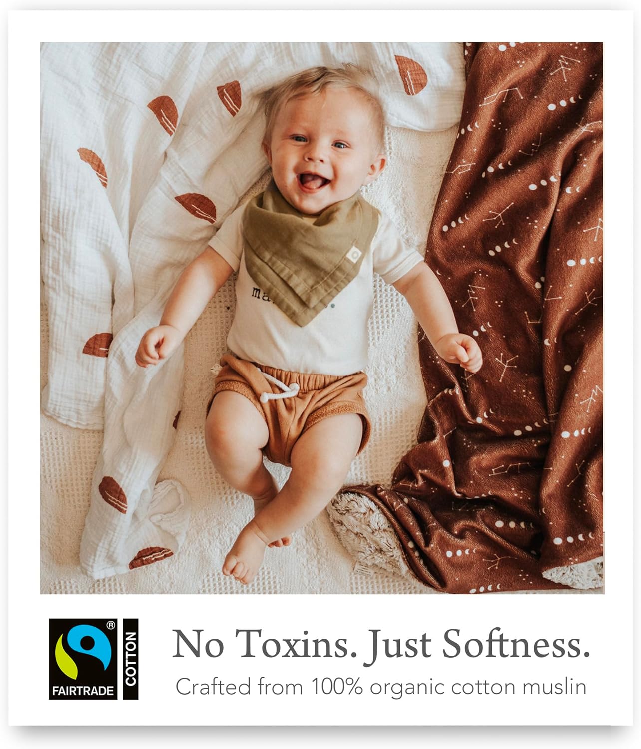 - GENTLE AND PREMIUM ORGANIC MUSLIN FABRIC - Pamper your little one with our Fairtrade-certified organic muslin bibs. Crafted from Sanforized (pre-shrunk) cotton, they're ultra-soft and crinkle-free, ensuring ultimate comfort against your baby's sensitive skin
