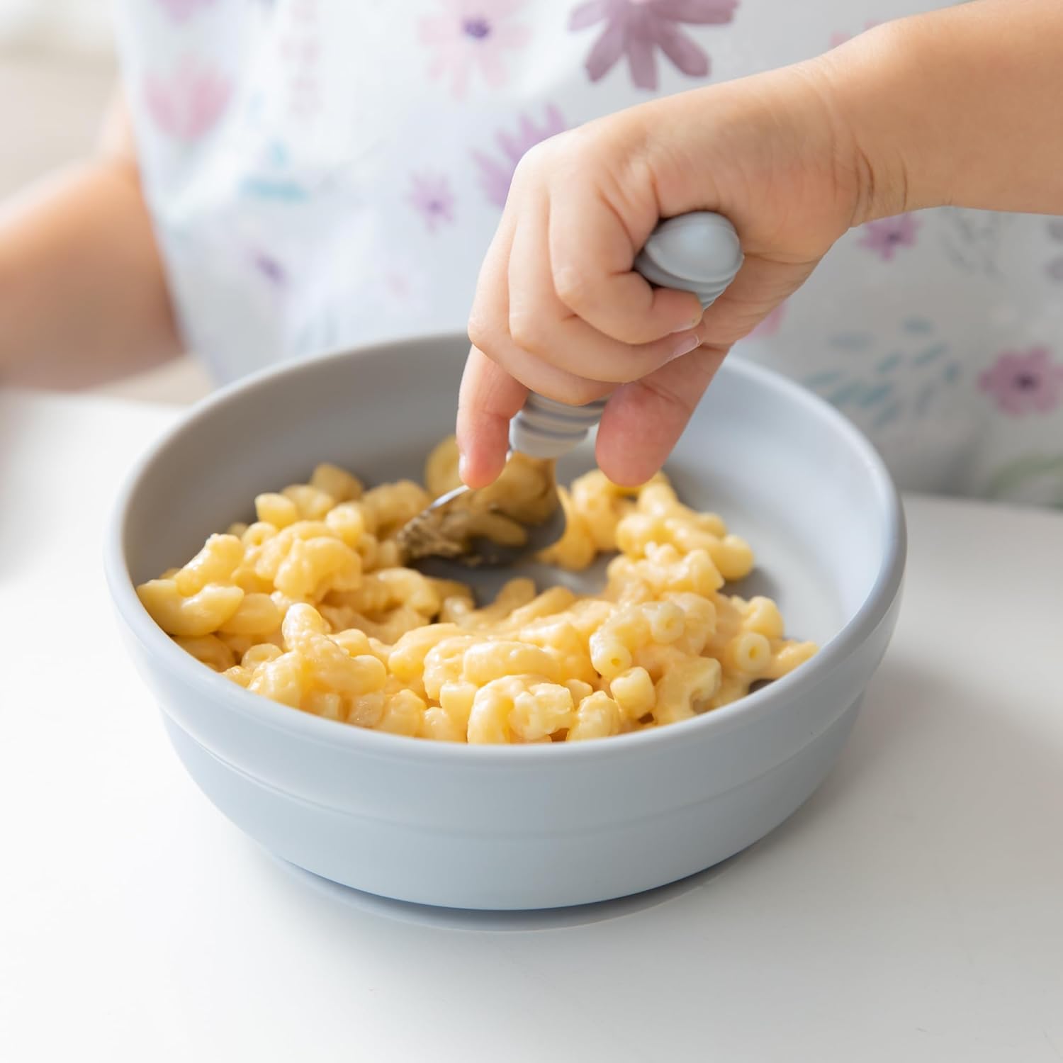Bumkins Toddler Utensils, Kids Size Fork and Spoon Set, Silicone and Stainless-Steel Training Silverware, Angled Forks / Sporks for Self-Feeding, Children Hold Learning to Eat, 18 Months Up, Gray
