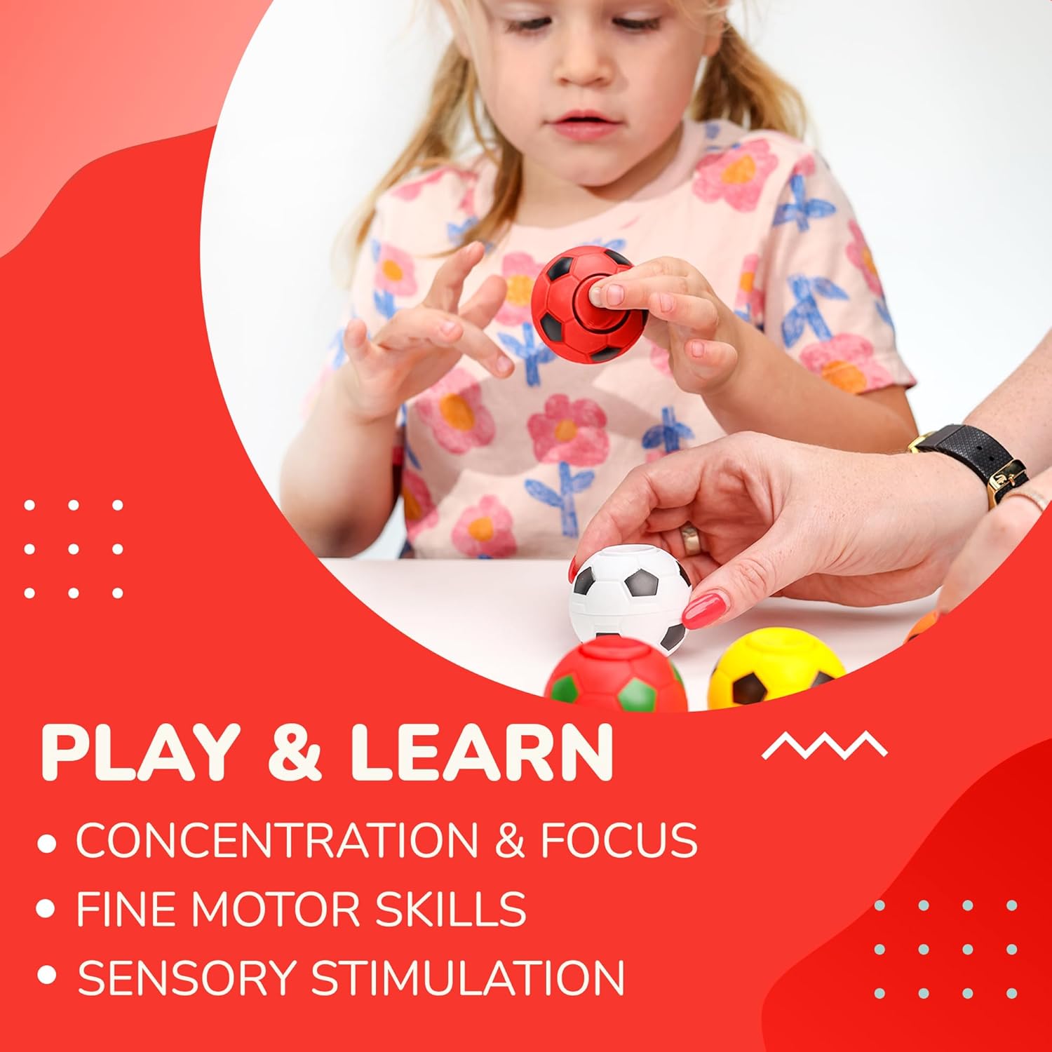 - Spinner toy have a red color. Spinner toys for kids resemble a soccer ball