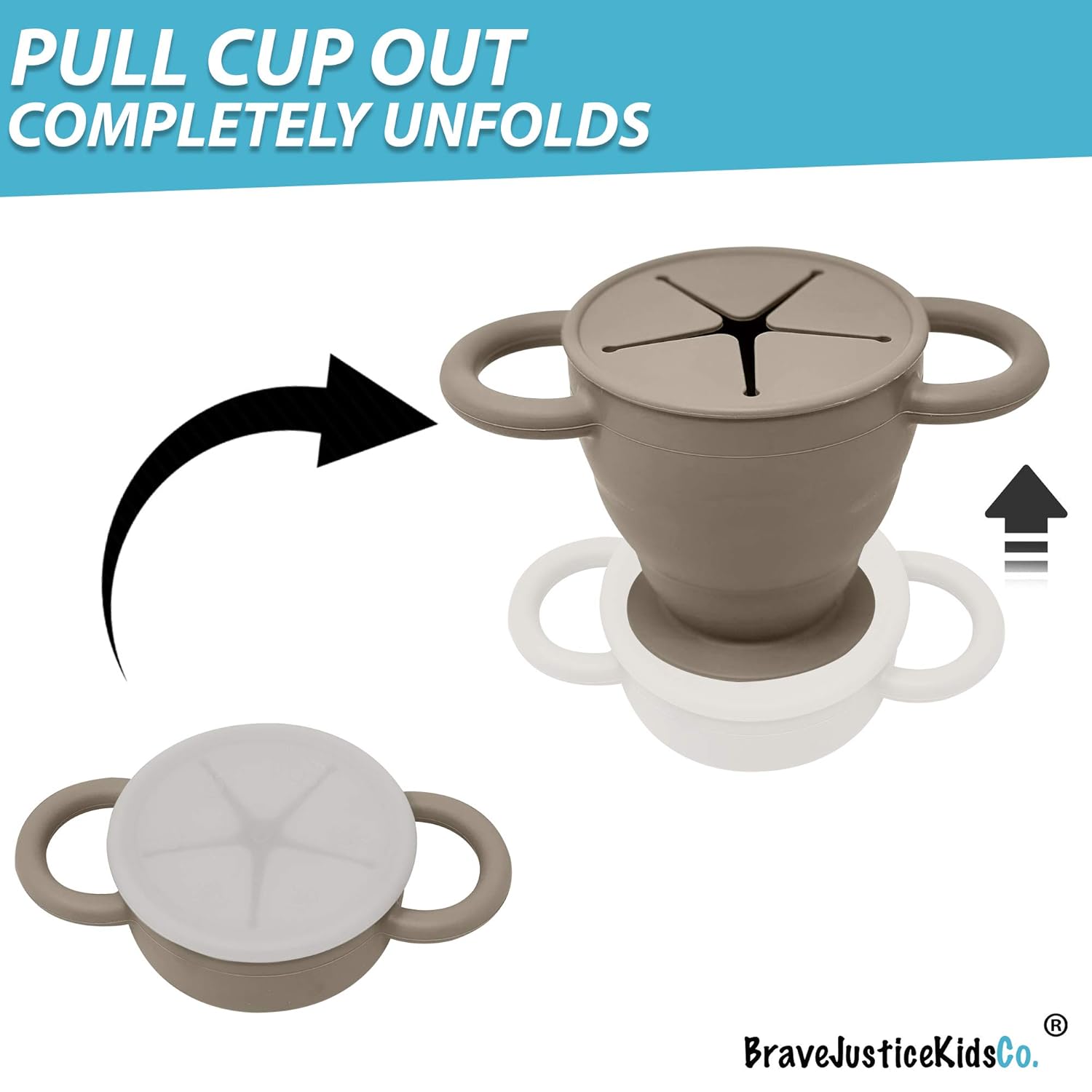 BraveJusticeKidsCo | Snack Attack II Snack Cup | Collapsible Silicone Snack Container | Toddler and Baby Snack Catcher Lid (Fog)
