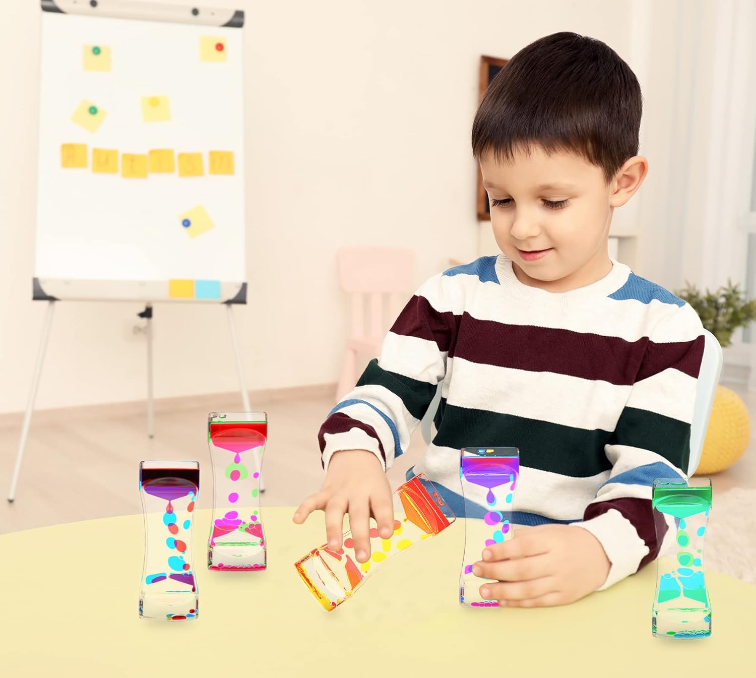 - 4. Great for Everyone: Each liquid timer contains two colors inside. The soothing colors remind you to slow down, relax, and enjoy each moment. Every order comes with 5 pack liquid motion timers, each with their own unique colors inside, giving you even more options for play! - Blue Green, Red Yellow, Blue Pink, Purple Yellow, Red Blue !