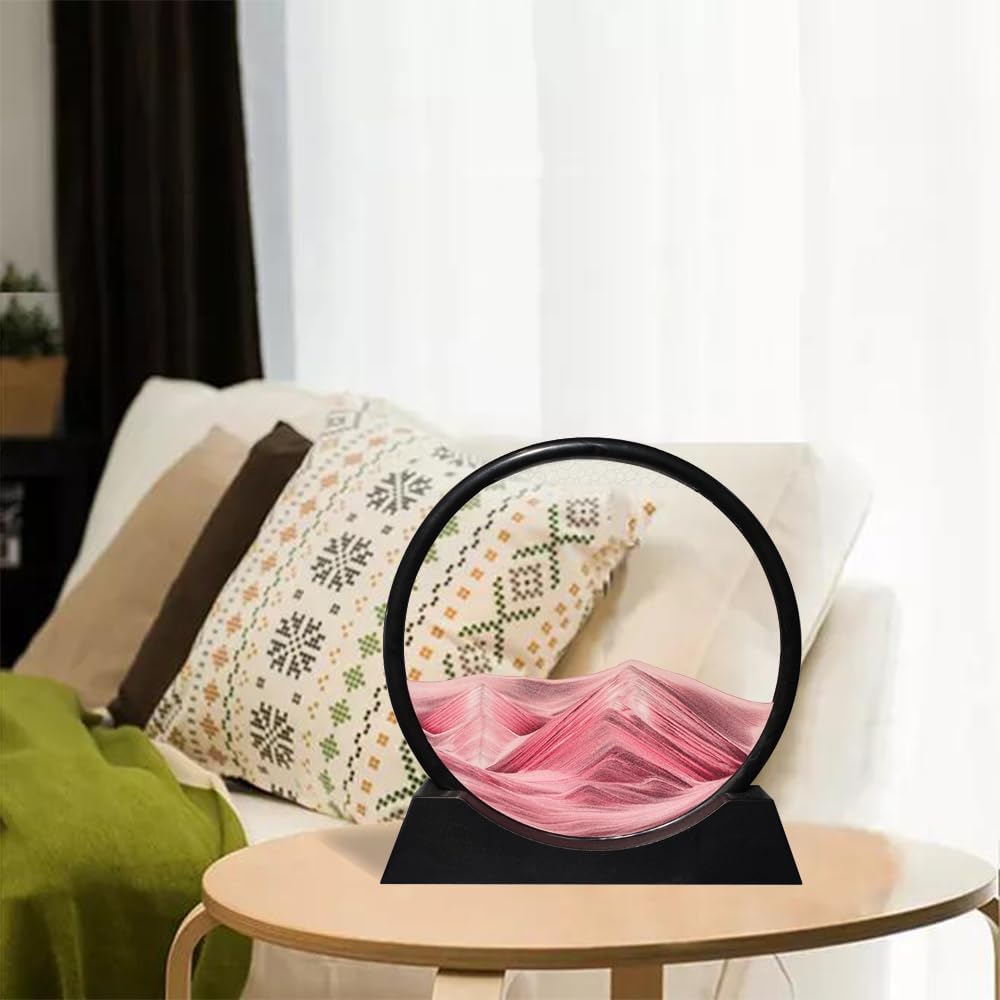 Aoderun Moving Sand Art Picture Round Glass 3D Deep Sea Sandscape in Motion Display Flowing Sand Frame Relaxing Desktop Home Office Work Decor (12", Pink)
