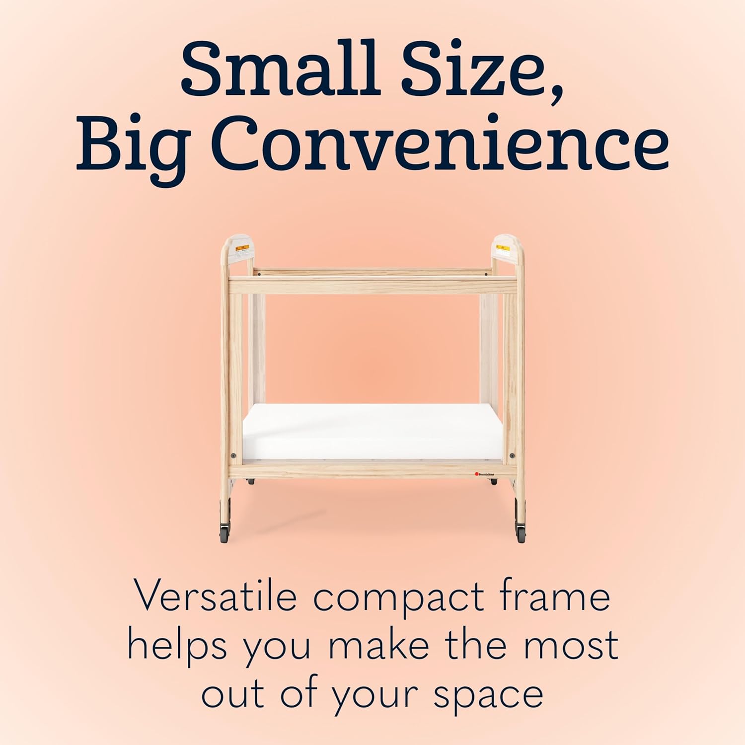 Foundations Serenity Compact Clearview Daycare Crib, Fixed Side, Durable Wood Construction, Non-Marking Casters (2 Locking), Includes 3” InfaPure Foam Mattress (Natural)